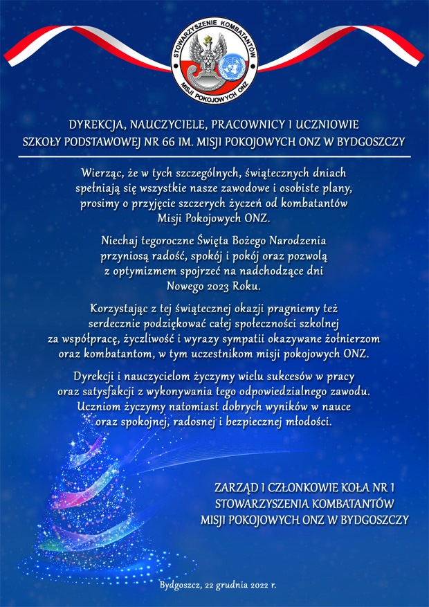 Nasze koło utrzymuje bardzo bliskie kontakty z bydgoską Szkołą Podstawową nr 66 im. Misji Pokojowych ONZ. Delegacja szkoły w osobach wicedyrektorek wzięła udział w naszym wigilijnym spotkaniu, które odbyło się w dn. 19 grudnia br. w Mesie Oficerskiej.