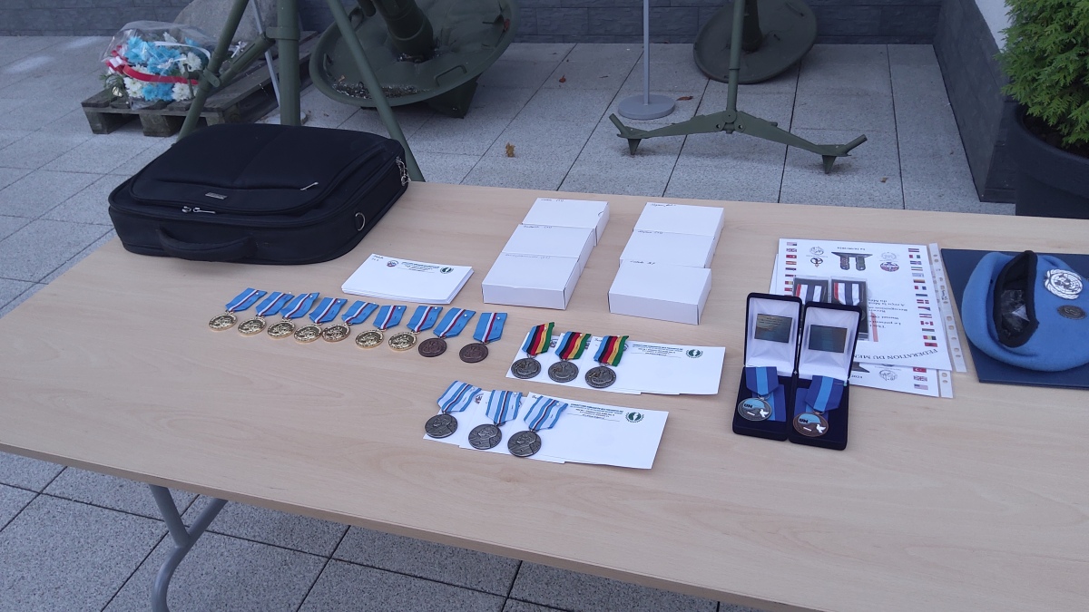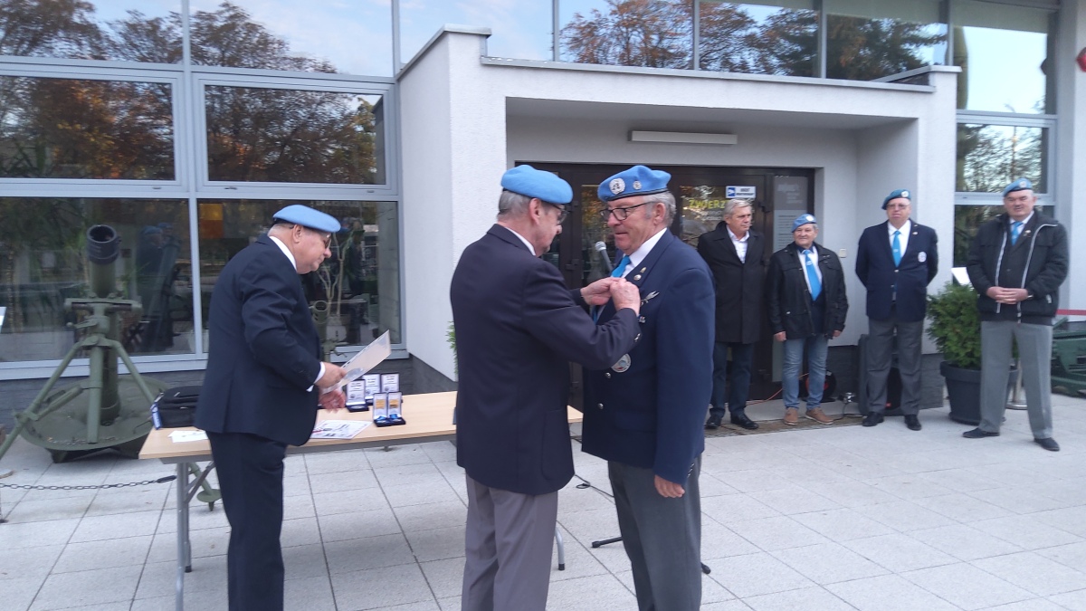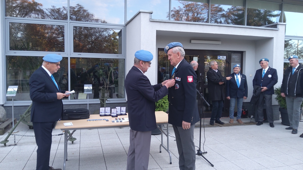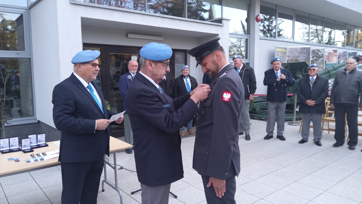 Następnie zostało udekorowanych kilkunastu naszych członków złotymi i brązowymi medalami za zasługi dla SKMP ONZ. Przy okazji wręczono też medale pamiątkowe i okolicznościowe. Tradycyjnie na zakończenie części oficjalnej przy Tablicy Pamiątkowej upamiętniającej żołnierzy pełniących służbę poza granicami kraju, złożyliśmy wiązankę kwiatów.