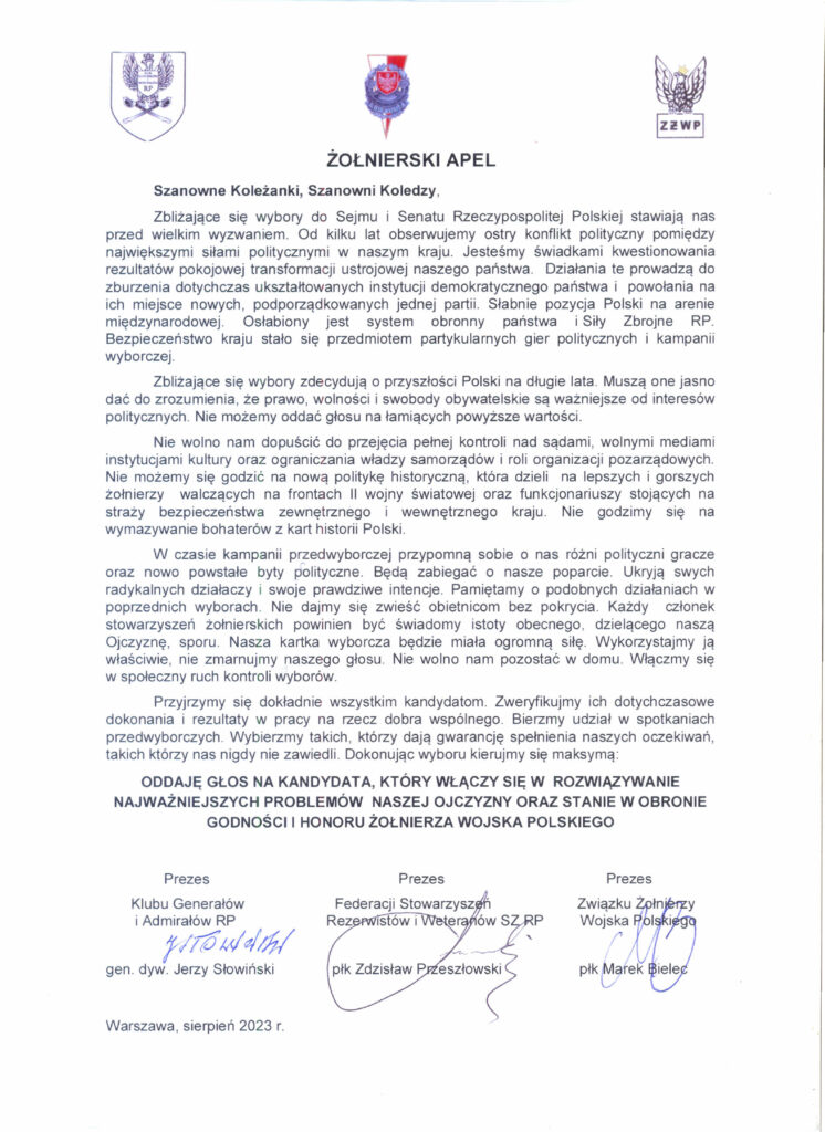 Zachęcam gorąco do zapoznania się z Apelem Żołnierskim wydanym przez główne organizacje zrzeszające byłych żołnierzy, weteranów i kombatantów z okazji zbliżających się wyborów do najwyższych władz państwowych. Nie trzeba nikogo z nas przekonywać, że będzie to wydarzenie przełomowe decydujące o naszej przyszłości. Pamiętajmy, że jesteśmy żołnierzami, teraz już w rezerwie i w stanie spoczynku, natomiast wartości, jakie przestrzegamy zawarte są w słowach przysięgi wojskowej, która wszyscy składaliśmy. Partie i ich szefowie zmieniają się i odchodzą, Ojczyzna zaś jest jedna i pozostaje. My, żołnierze i kombatanci służymy Ojczyźnie i jej wartościom zawarowanymi w Konstytucji. Naszym największym obowiązkiem i honorem jest im służyć i bronić ich nienaruszalności.